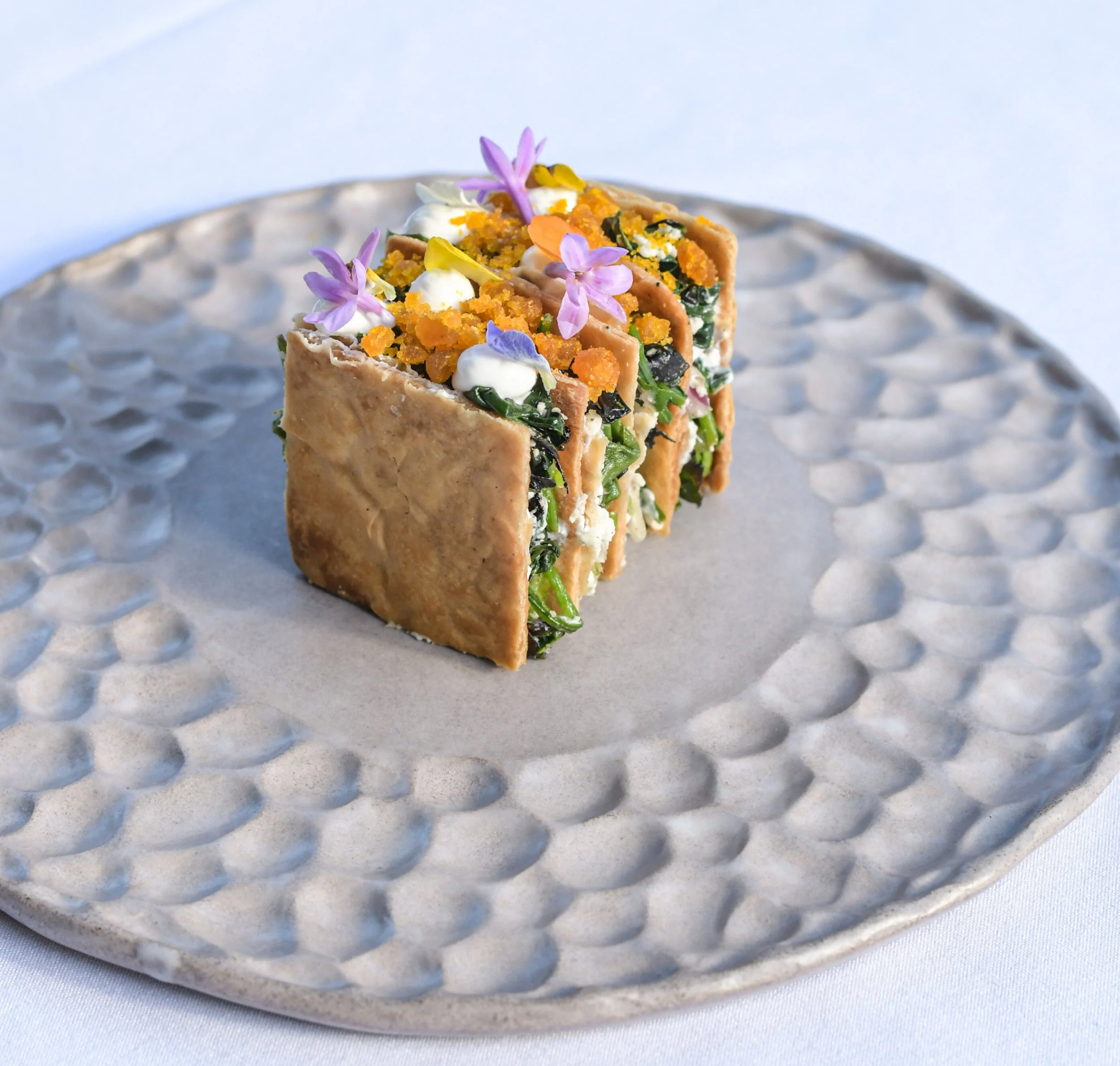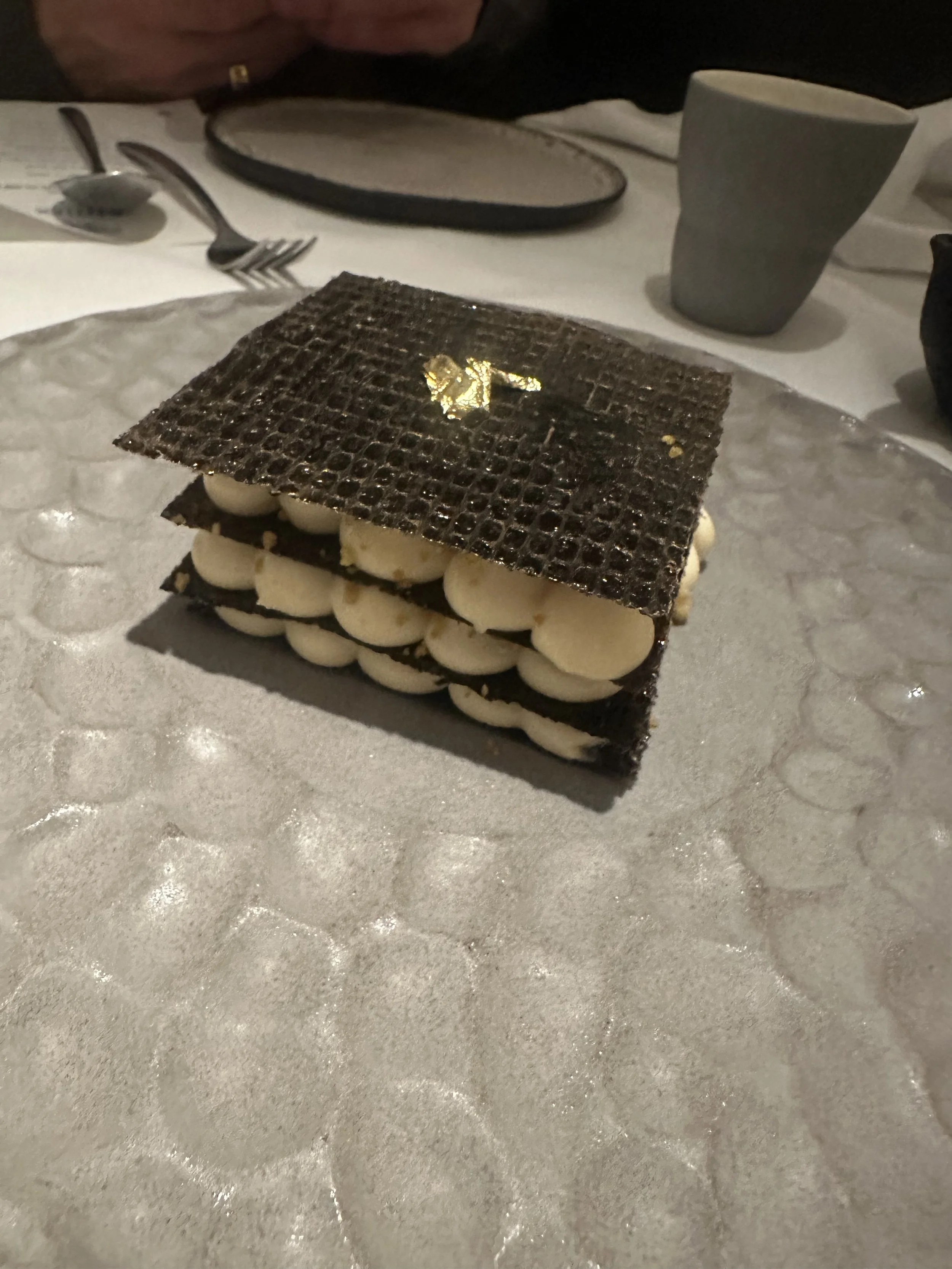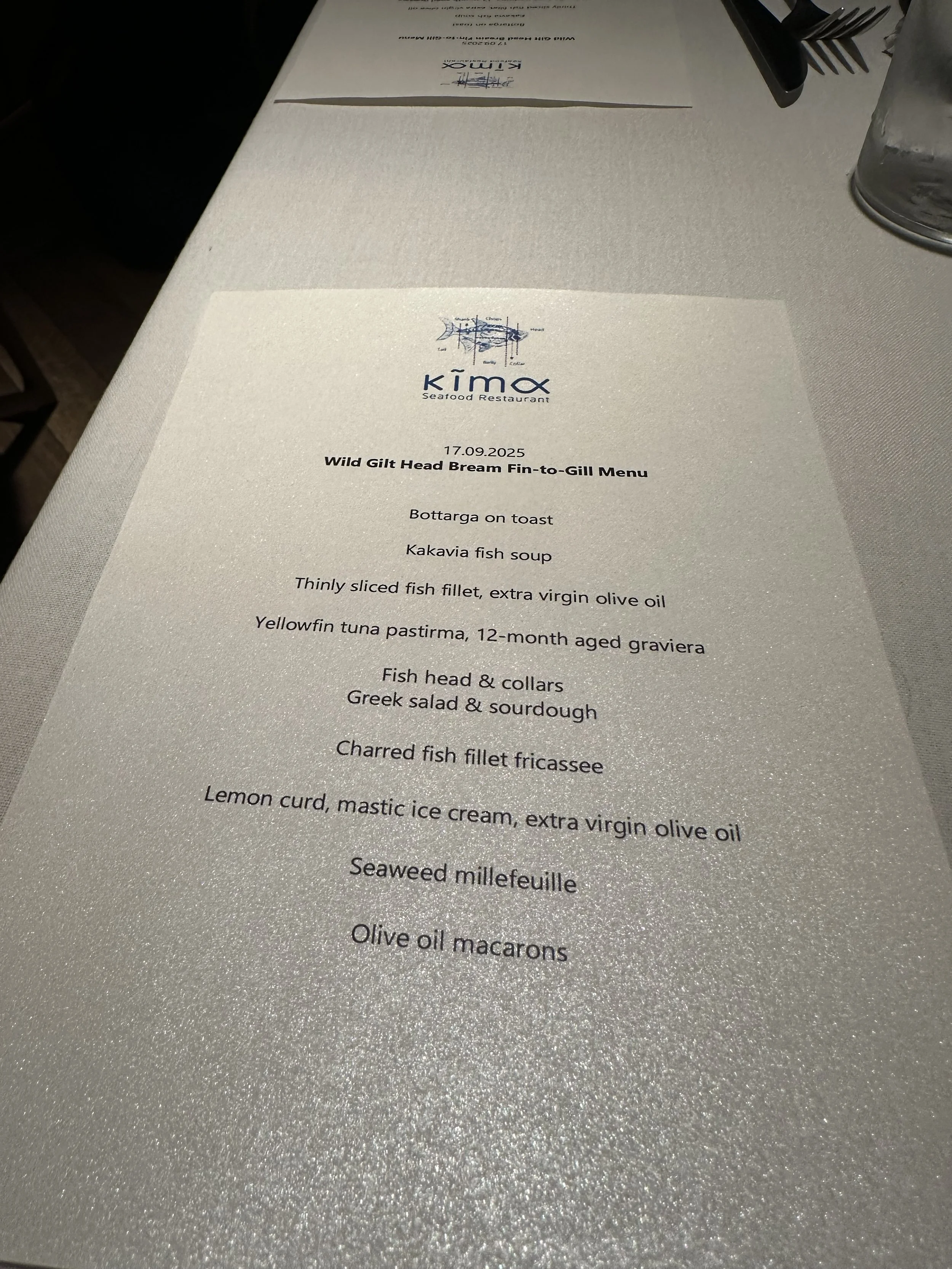 The experience began with a visit to the fishmonger’s tank at the front of the restaurant, where freshly caught creatures lay ready for our selection. The idea is to pick one fish, which is then transformed into a series of dishes. For us, wild gilt-head bream became bottarga on crunchy toast with lemon curd and white chocolate, lightly cooked chunks in a traditional Kakavia soup, and roasted heads and collars served with Greek salad and fluffy sourdough. A seaweed mille-feuille followed, its airy cream layered between crisp, sweetened seaweed slices.